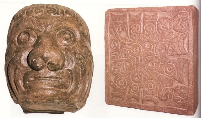 Izquierda: Cabeza chavinoide (Museo Arqueológico, Lima). Las formas grotescas y algo caricaturescas del rostro recuerdan a algunas máscaras griegas. Los ojos saltones, la nariz prominente y las arrugas de las mejillas en una forzada sonrisa pueden ofrecer la imagen de un alienado o de un hombre en pleno trance. Derecha: Relieve chavinoide (Chavín de Huantar, Perú). Los artistas del gran centro ceremonial de Chavín de Huantar dominaron a la perfección el labrado de la piedra. Los relieves chavinoides se caracterizan por sus figuras estilizadas, comunmente inspiradas en la fauna y la flora andina, y su ejecución enérgica.