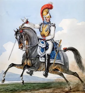 1er Regimiento de Coraceros - Trompetistas. Parte de una serie que relata los uniformes de la Grande Armée de Napoleón, 1812